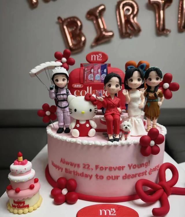 与工作人员共度时,看似普通的盒饭里藏着鲍鱼、烤鳗鱼、芦笋卷培根等豪华食材,粉色定制蛋糕上的翻糖人偶,还原了她的多个经典影视形象,足见团队对她的用心。