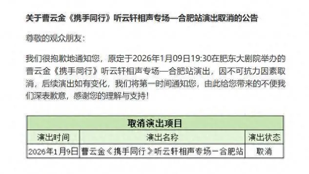 “不可抗力”四个字,让合肥的冬天又冷了几分。 曹云金原定2026年1月9日在肥东大剧院的相声专场突然取消,公告简单写着“不可抗力”,却像块巨石砸进相声圈这潭深水。 购票观众措手不及——假请好了,酒店订在罍街附近,就等演出开场,结果手机一震亚投金融,演出没了。