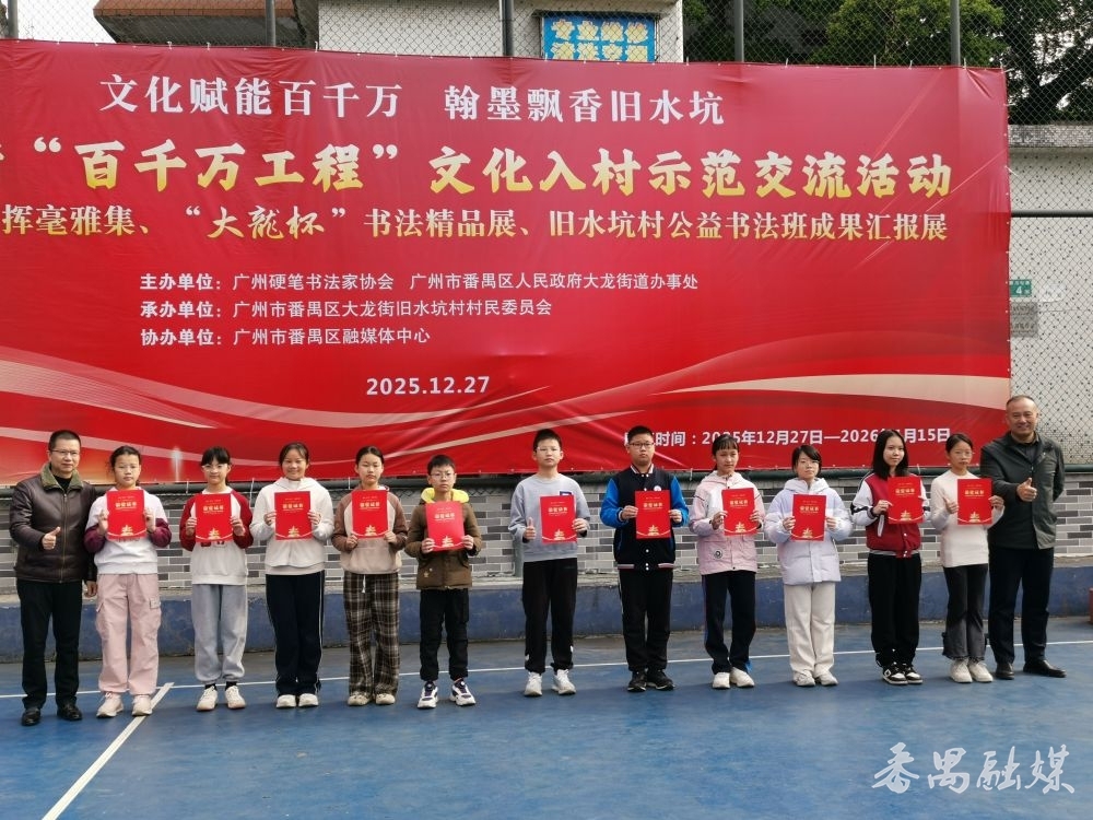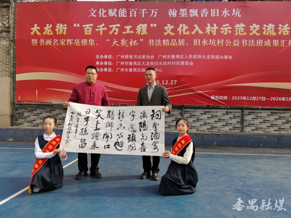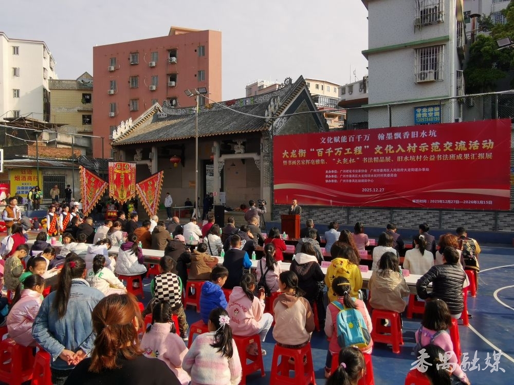 12月27日上午,“文化赋能百千万·翰墨飘香旧水坑”——大龙街“百千万工程”文化入村示范交流活动暨书画名家挥毫雅集、“大龙杯”书法精品展、旧水坑村公益书法班成果汇报展在大龙街旧水坑村陈尚书祠举行。本次活动由广州硬笔书法家协会、大龙街道办事处主办悦来网,旧水坑村委会承办,番禺区融媒体中心协办,通过系统总结、展示与推广旧水坑村在文化赋能乡村实践中的经验做法,为番禺区纵深推进“百千万工程”提供可复制、可操作的文化振兴样本。