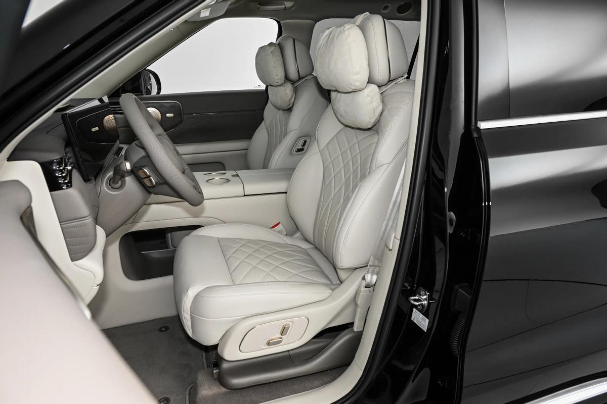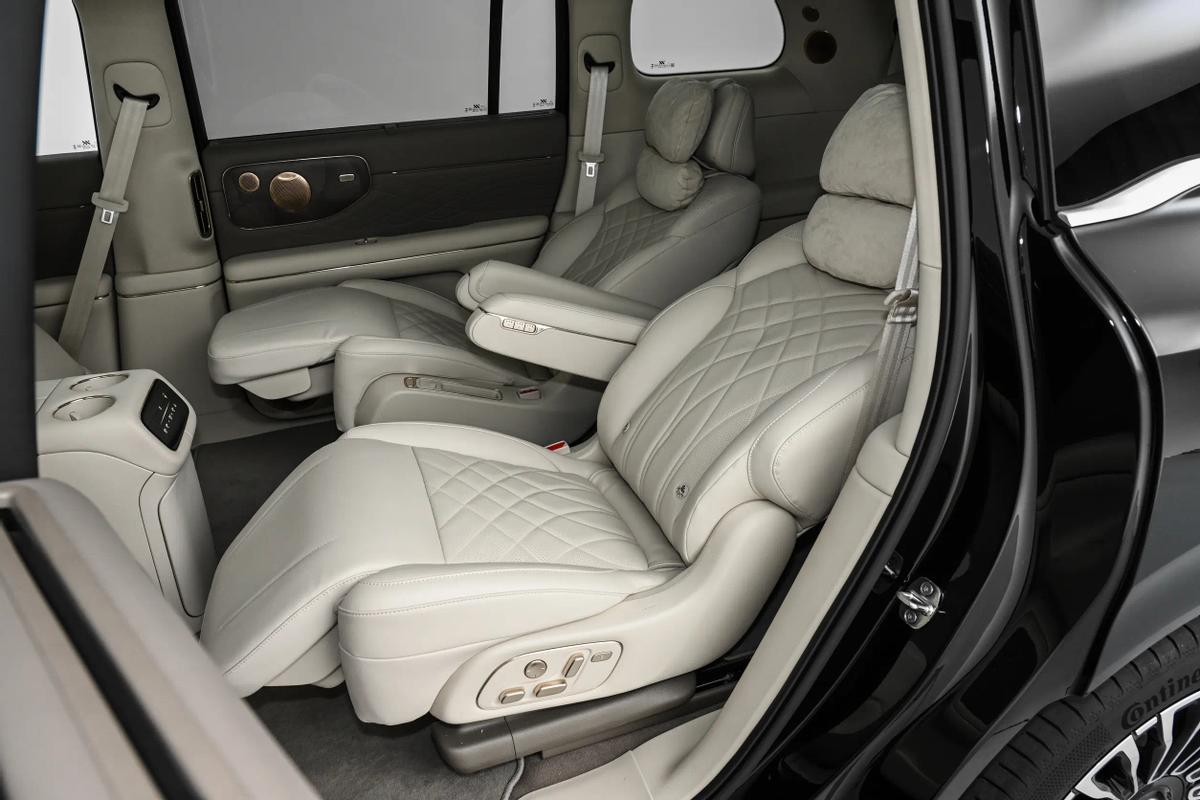 舒适方面,智己LS9采用2+2+2的六座布局形式,全车座椅均为真皮包覆,并提供了副驾+二排共3张零重力座椅。功能上,三排座椅均支持加热与电动靠背调节和业众,前两排还支持通风与按摩功能(主驾为4D机械式按摩/二排右侧可选装)。有意思的是,相比起问界M9、理想L9等车强调主驾体验的做法,智己LS9的主驾驶座椅反倒只有比较基础的8向电动调节,这是不是真成了“牛马司机”专座?不过,车辆虽说有新风系统,但却没有提供车载香氛与空气质量监测,这跟我们看到的问界们也是有配置选择差异的。