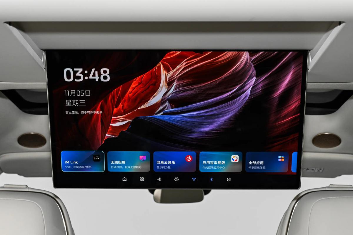 内饰方面,智己LS9采用的环抱式座舱完成了比较清晰的上下层、主副驾驶分区。通过中控、门板扶手以及扶手箱形成的分层,座舱主体分为上下两个部分,上层布局了出风口、控制台以及包括27.1英寸一体式5K屏+15.6英寸副驾3K娱乐屏在内的信息娱乐硬件;而下层则有不少独立储物格,车内还有支持ERNC 2.0主动降噪+25扬声器的B&O立体环绕声音响,并为第二排准备了21.5英寸吸顶屏,全车人都可以获得足够的娱乐支持。
